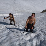 Sestup je již standardní přes ferratu (B) do sedla nad ledovcem a po levé straně ledovce (při pohledu ze svahu dolů) až na chatu Adamek. Na chatu dorážíme kolem 14h – rychle stíháme jedno pivko, přebalit batohy a o půl čtvrté vyrážíme na sesup k autu. U jezera Hinterer Gosausee ještě dáváme rychlou koupačku a v 19h už sedíme v autě a míříme směrem Brno, kam dorážíme pár minut po 23h.