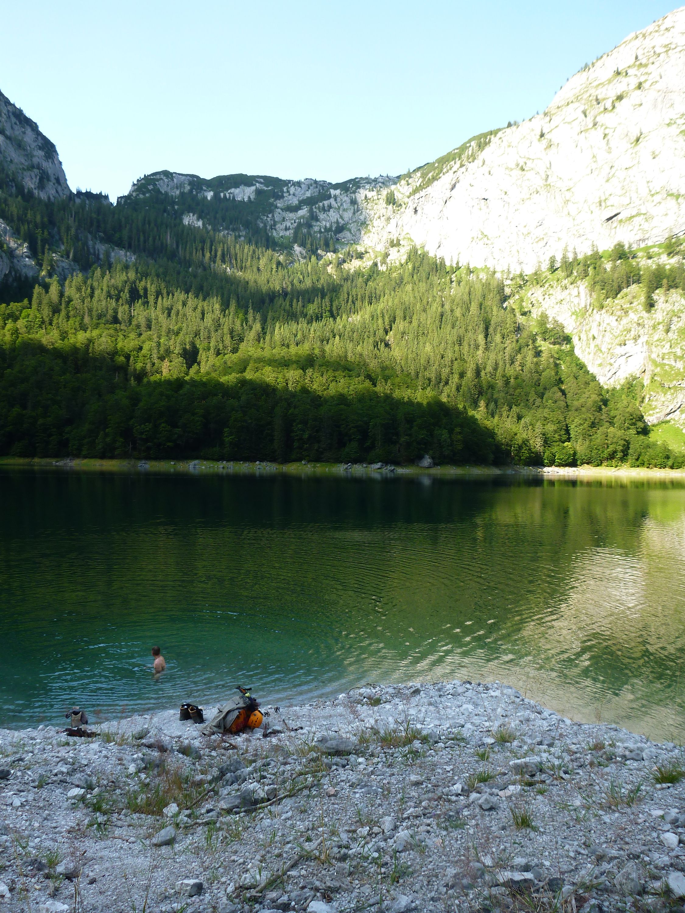 Ráno odjíždíme kolem 8 a o hodinku později již vyrážíme z parkoviště (neplacené) u Gossausee. Čeká nás poměrně dlouhých 15km s převýšením cca 1300m. Jezero je ve výšce 950m a chata 2196m. Rezervaci na chatu nemáme – bylo plno. Trasa vede zcela logickou linií mezi oběma gossauskými jezery a pak pokračuje výšvyhem nad prahem lesa až na chatu. Cesta není nijak obtížná – k zadnímu jezeru vede šotolinová cesta a pak už jen pěšinka až na chatu. Na chatu dorážíme kolem 13h. Jelikož se nám celou dobu nad hlavami honí mraky, tak si dáváme jen krátkou půlhodinovou pauzu a zabíráme poslední 3 místa v chatě.